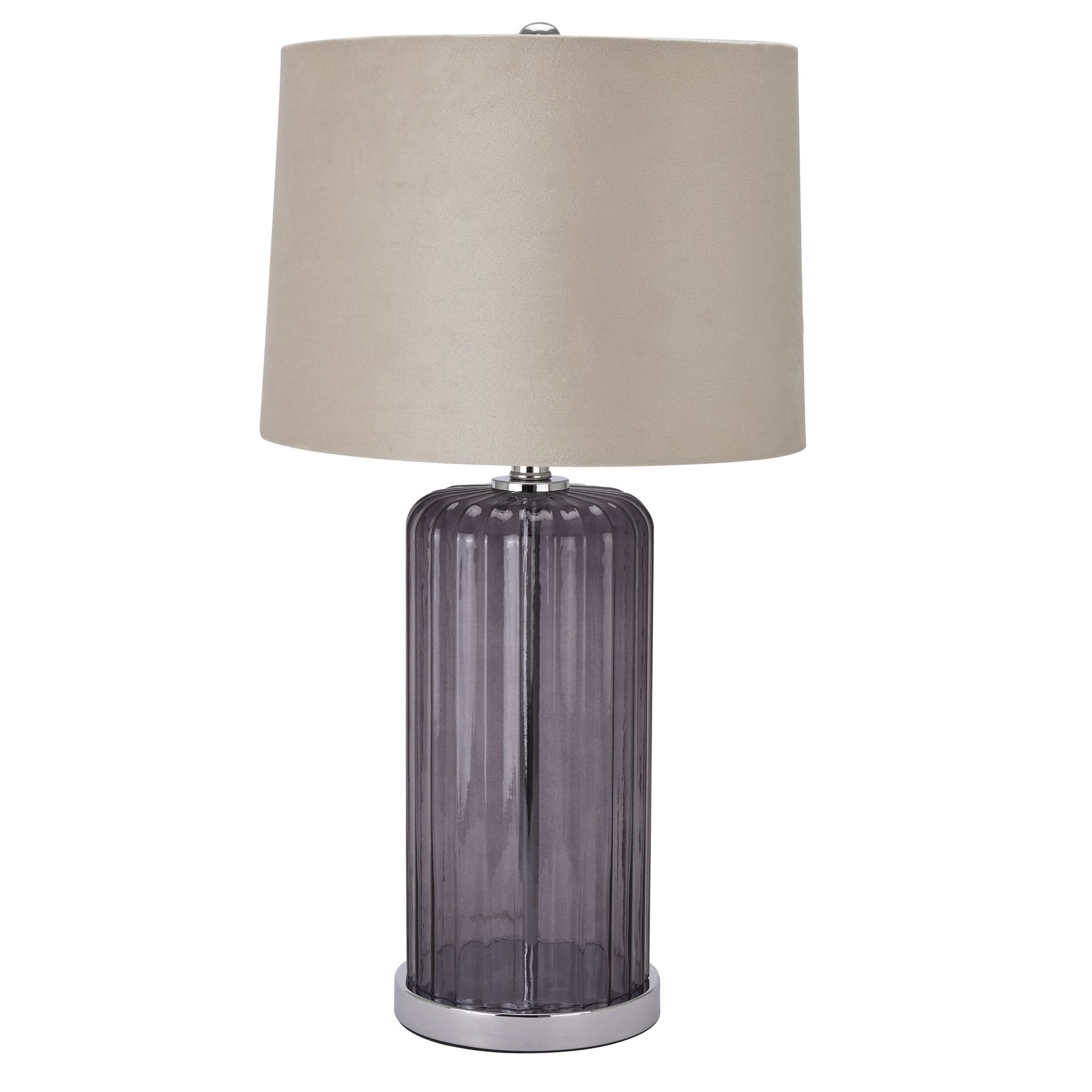 This is the Alberta Metallic Glass Lamp With Velvet Shade. A stylish statement lamp with a uniquely shaped handcrafted reeded / ribbed glass base. This lamp comes complete with neutral velvet shade and in-line switch and will tone beautifully with a variety of decor schemes.