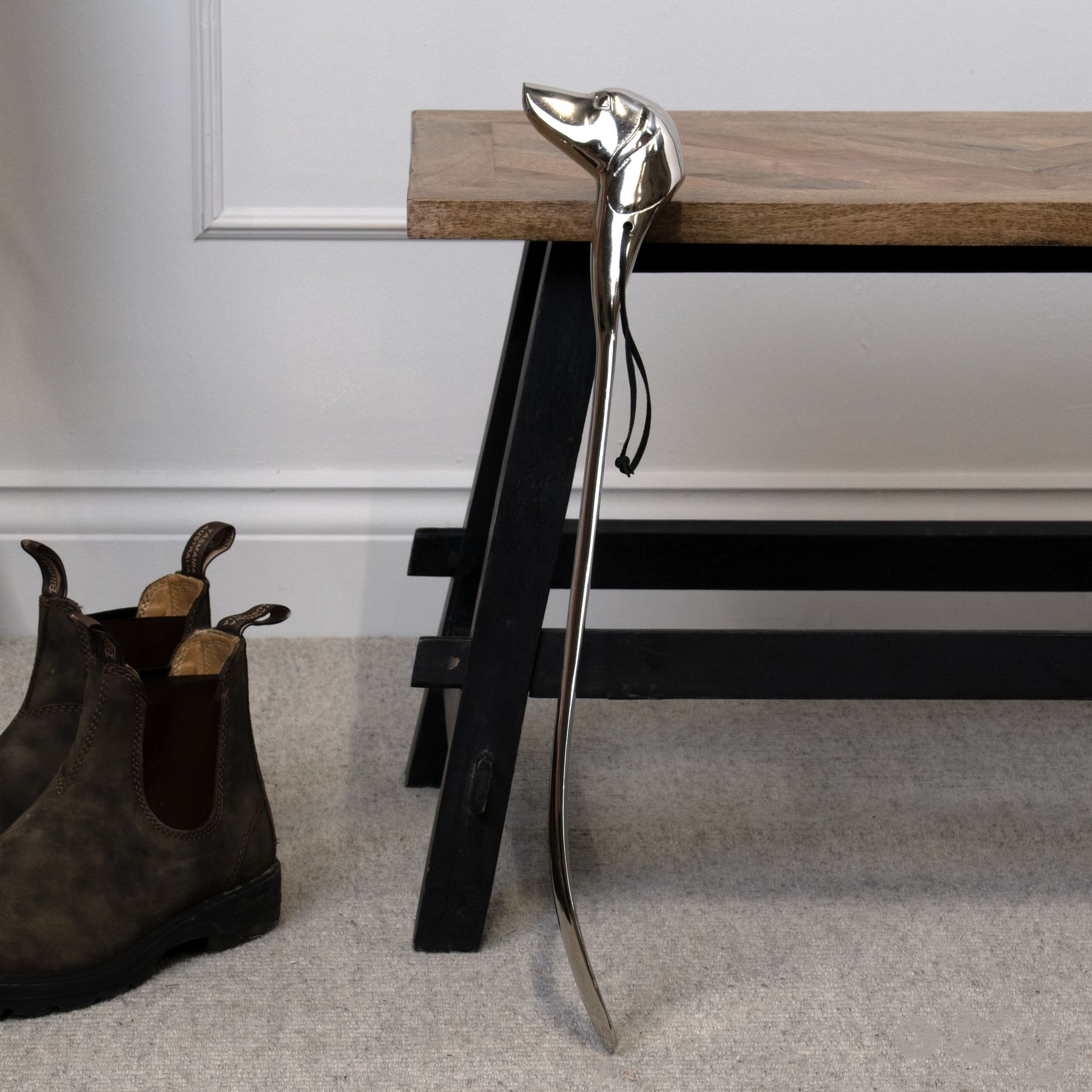 Masterfully crafted in silver nickel, this refined shoe horn presents a distinctive canine head design that marries practicality with luxurious aesthetics. The polished metallic surface reflects light beautifully, creating an air of refinement in any setting while serving an essential purpose. Part of an exclusive collection of distinctive accessories, this piece coordinates seamlessly with its companion designs featuring equestrian and stag motifs. The long-handled profile ensures comfortable use while maintaining an understated grace that appeals to discerning customers. For retailers seeking to create compelling displays, this shoe horn pairs magnificently with the matching silver nickel bottle stoppers in dog, horse, and stag designs, offering customers coordinated selections for thoughtful gifting or personal indulgence. The refined metallic finish harmonises with both traditional and modern d?cor schemes, making it an astute choice for retailers catering to varied clientele. When merchandised alongside our coordinating silver nickel accessories, this shoe horn becomes part of a cohesive collection that speaks to customers who value both functionality and refined d?cor. The substantial feel and weight of the piece communicates quality craftsmanship, while its practical application ensures it will become a cherished daily-use item in any home.