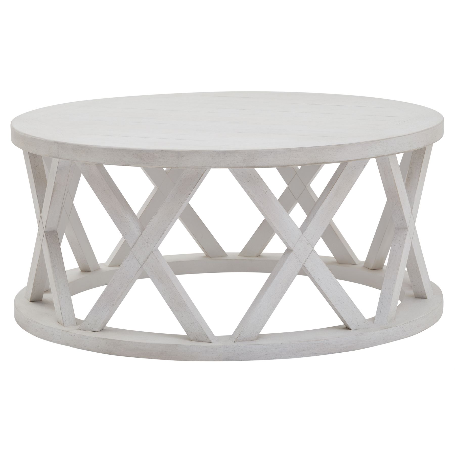 This is the Stamford Plank Collection Round Coffee Table. The Stamford collection?s coffee tables really show the range?s attractive lattice pattern off to the full. The open, airy, lattice breathes a freshness into any space. Pared back, timeless and with a weathered familarity, items from this range will feel like they’ve always been there the moment they arrive. Deliberately distressed, this handmade, planked pine coffee table has an inviting lived-in look, coupled with a calming colour-way.